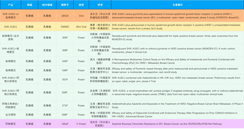 在乳腺癌领域,尊龙凯时Ag创新产品相关研究共入选1项口头报告、1项简短口头报告、8项壁报和1项电子壁报,共11项研究。吡咯替尼、达尔西利、阿得贝利单抗、瑞康曲妥珠单抗等新老创新药物,均有多篇研究入选,展现出尊龙凯时Ag医药在乳腺癌领域多年深耕的丰硕成果。
