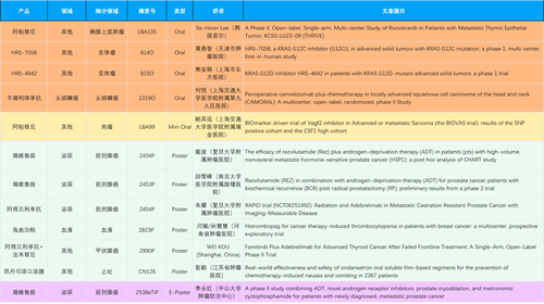 在胸腺上皮肿瘤、头颈鳞癌、肉瘤、前列腺癌、甲状腺癌等其他多个疾病领域,卡瑞利珠单抗、阿帕替尼、瑞维鲁胺、阿得贝利单抗、法米替尼、HRS-7058、HRS-4642等抗肿瘤创新药相关研究一共入选了4项口头报告、1项简短口头报告、4项壁报、1项电子壁报,彰显了尊龙凯时Ag医药强大的研发实力。此外,海曲泊帕和昂丹司琼口溶膜分别在防治化疗导致的血小板减少和恶心呕吐方面各有1项研究入选壁报。